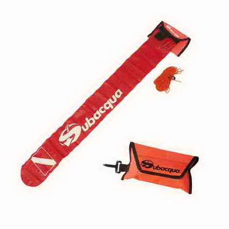 This small orange DSMB is ideal for the travelling Diver. It neatly foalds away into the pouch with the line on top.